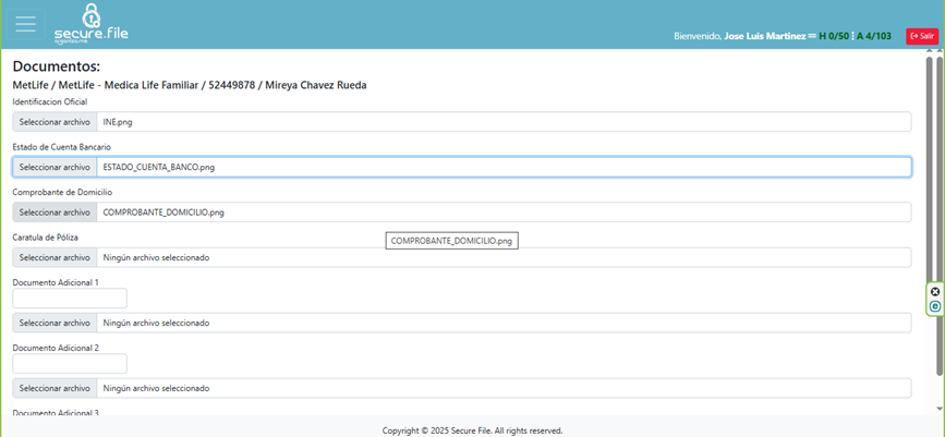 Como se muestra en la siguiente imagen vienen una serie de documentos que se solicitan por default para la documentación basica de una contratación de una poliza basta con adjuntar el archivo en donde viene la versión digiral de ese documento. Se hace la aclaración que los documentos que se adjunten no pueden superar 1 MB de espacio de almacenamiento.