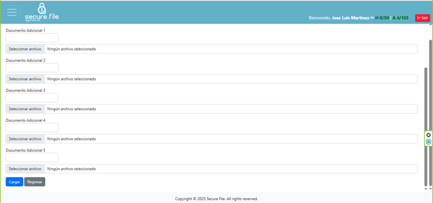 Aparecen los nombres de los documentos previamente configurados y enseguida viene la indicación de seleccionar el archivo para adjuntar, una vez que se tiene adjunto el archivo en la cajita de texto que esta adelante del botón de selección de archivo se puede adjuntar el documento en cuestion.