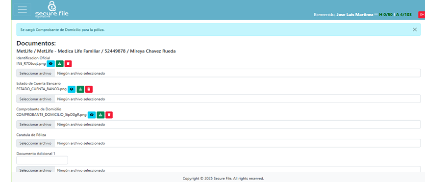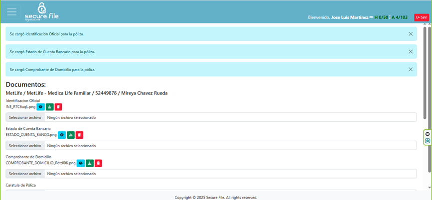 Una vez que se van cargando los documentos nos va confirmando la acción el sistema a través de mensajes informativos, como por ejemplo el mensaje de "Se cargo identificación Oficial para la póliza".