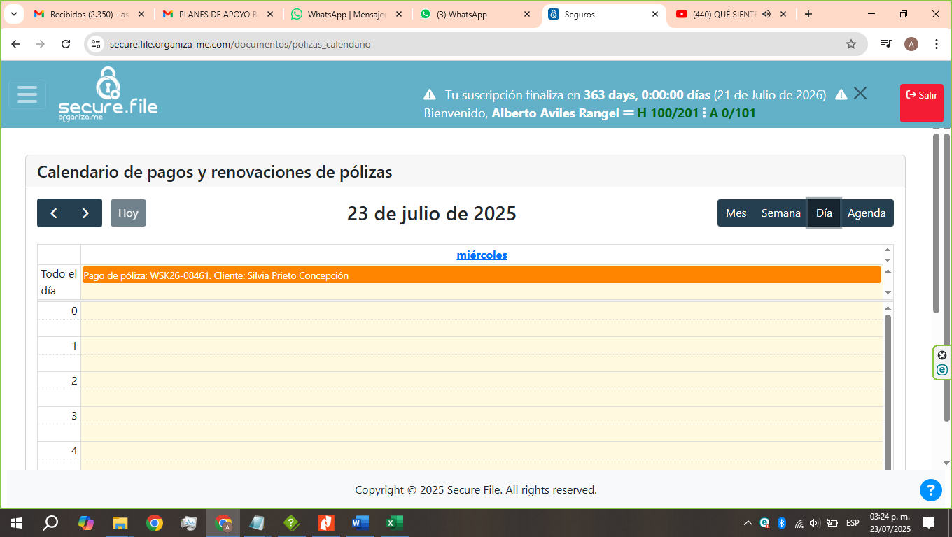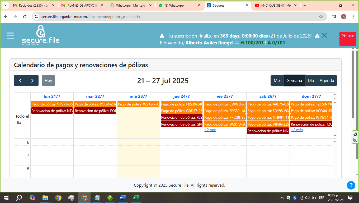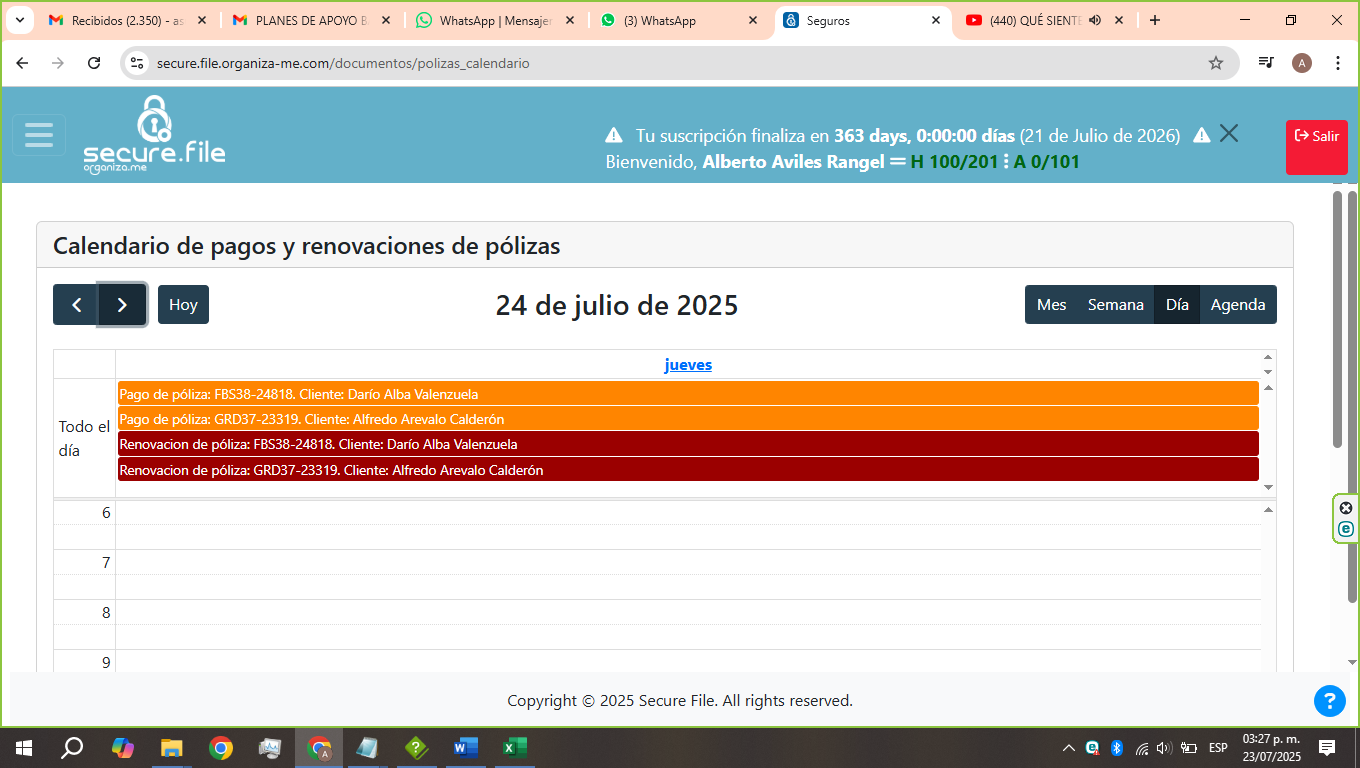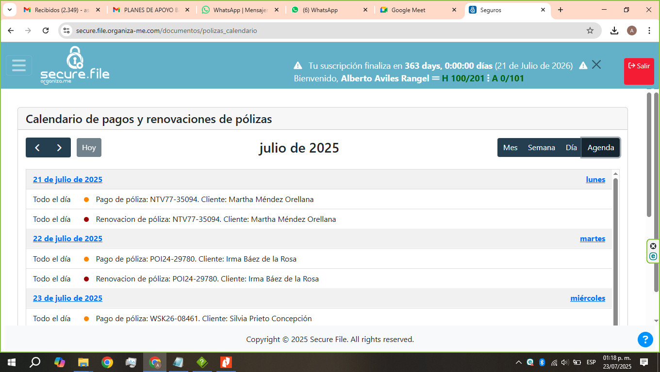 Para mejor control de la calendarización de los pagos y renovaciones de las polizas de los clientes el sistema cuenta con una opción permite la visualizacion de esta información en un formato de Agenda en donde de manera rapida se puede ver por dia cuales son los eventos que estan programados a vencer, como se muestra en la siguiente imagen.
