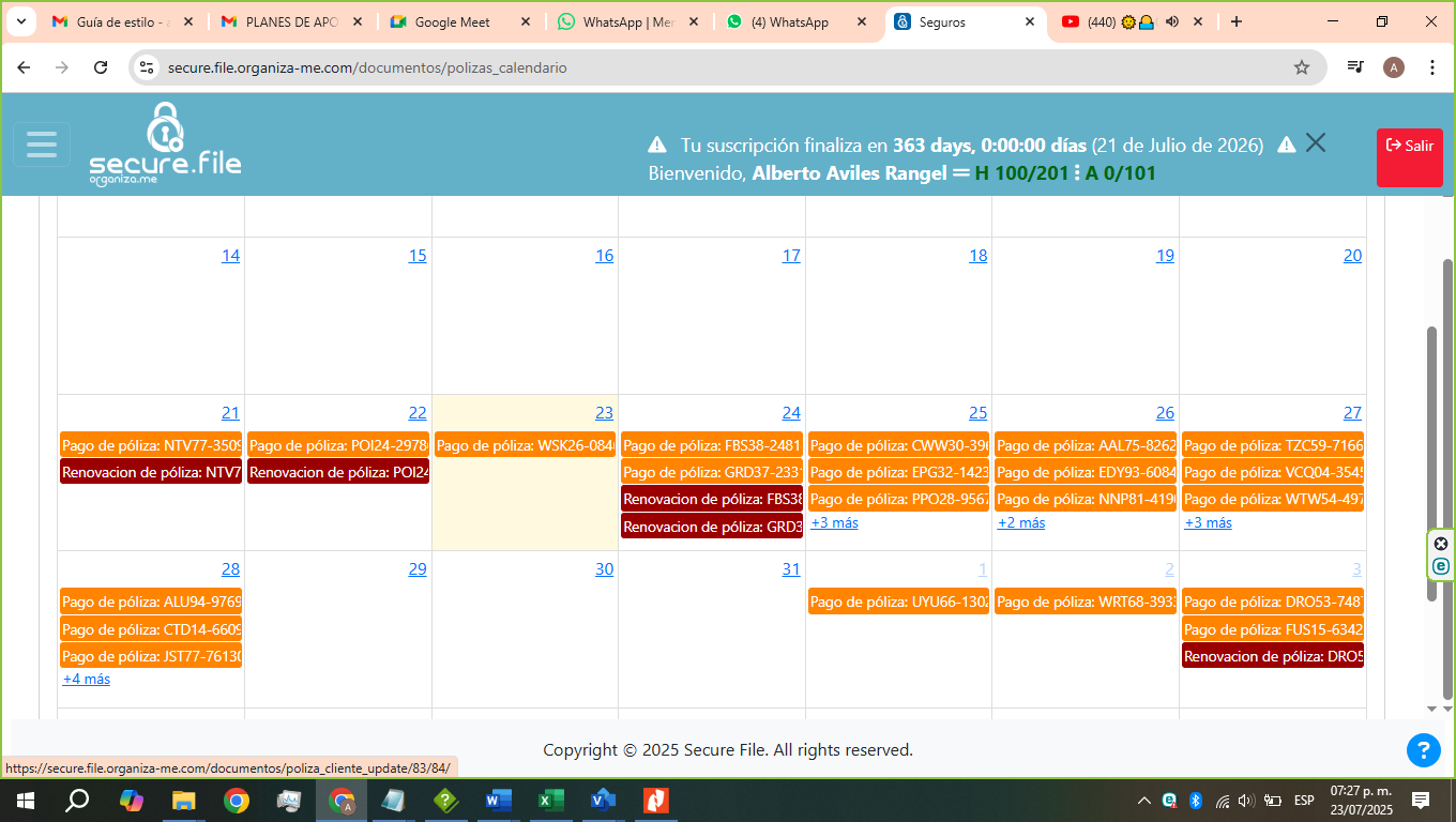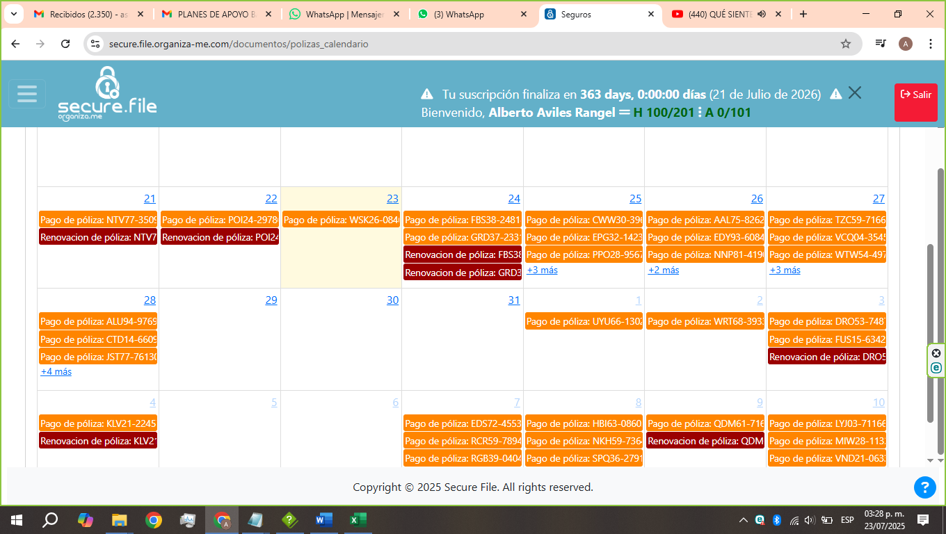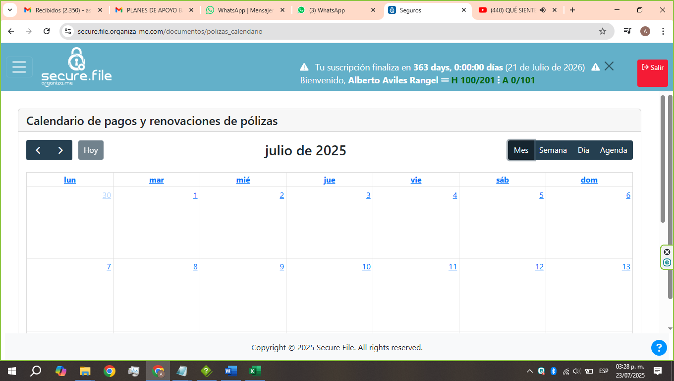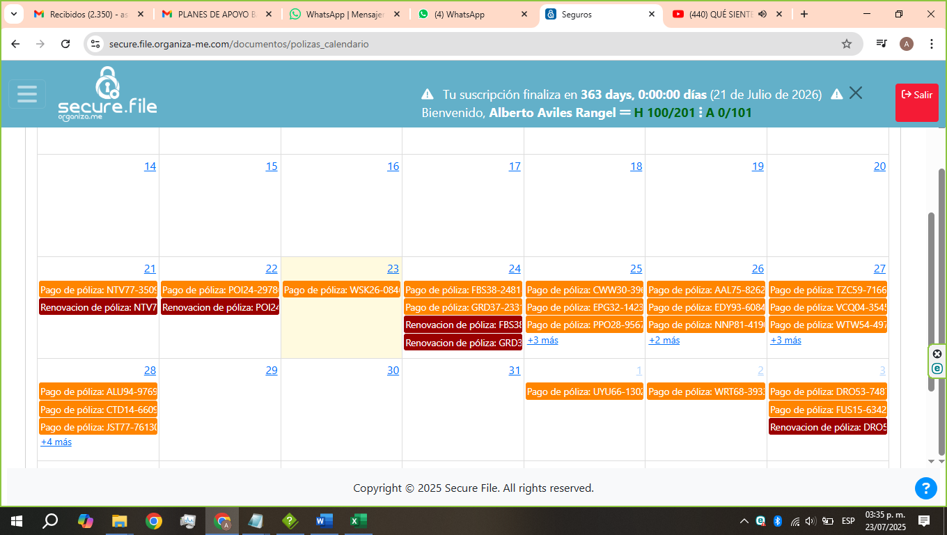 Para mejor control de la calendarización de los pagos y renovaciones de las polizas de los clientes el sistema cuenta con una opción permite la visualizacion de esta información en un formato de Agenda en donde de manera rapida se puede ver por dia cuales son los eventos que estan programados a vencer, como se muestra en la siguiente imagen.