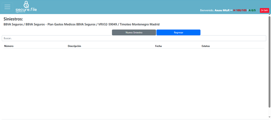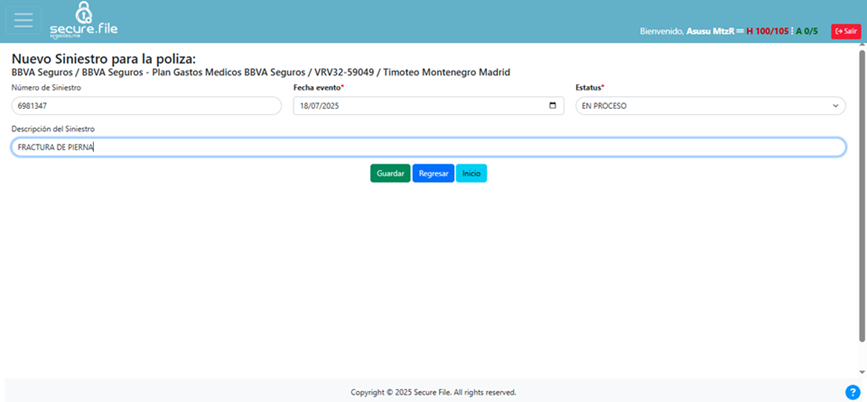 Cuando se materializa algun evento para lo cual fue contratada la poliza del cliente, este dara aviso del reporte de estos eventos a traves del concepto de siniestros. Los siniestros son dados de alta en la poliza que los soporta, se tiene la seccion de Siniestro y una vez que se elije entramos a una pantalla donde se puede dar de alta un "Nuevo Siniestro"